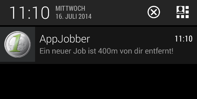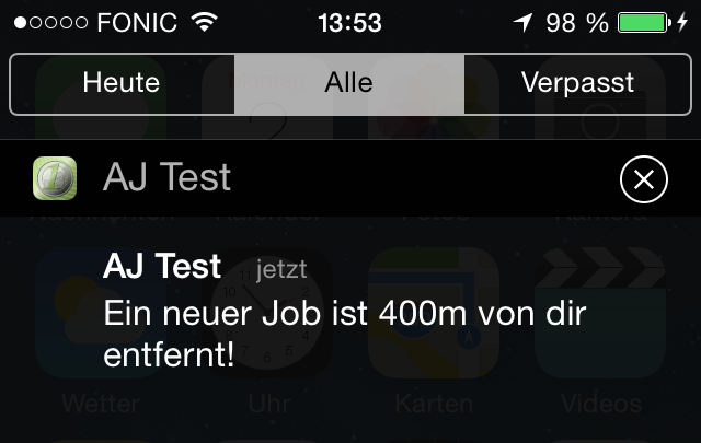 Avec les nouvelles alertes-job-sur-place tu seras informé des jobs dans tes environs. Aussitôt que tu te trouves dans les environs immédiats d'un nouveau job, tu reçois une notification Push en temps réel (voir ci-dessous), qui te signale ce nouveau job.